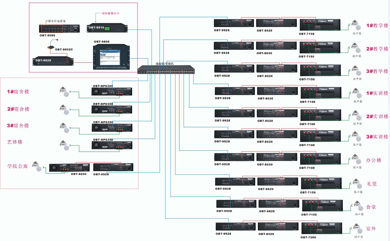 1)具備有分散式和集中式管理模式,分散式是在學(xué)校4個(gè)校區(qū),每個(gè)廣播區(qū)域(教學(xué)走廊、室外走道、宿舍走廊、戶外運(yùn)動(dòng)場(chǎng)、學(xué)生食堂、校園周邊環(huán)境帶等區(qū)域)設(shè)置網(wǎng)絡(luò)音頻終端,滿足各個(gè)教室、各個(gè)區(qū)域可以進(jìn)行獨(dú)立廣播和控制;集中式是在學(xué)校總廣播站設(shè)置系統(tǒng)服務(wù)器、及各分控站,利用學(xué)校網(wǎng)絡(luò),把各個(gè)區(qū)域廣播音頻終端、網(wǎng)絡(luò)尋呼站和分控軟件操作系統(tǒng)連接起來(lái),組成一套數(shù)字化網(wǎng)絡(luò)廣播系統(tǒng),進(jìn)行統(tǒng)一管理;