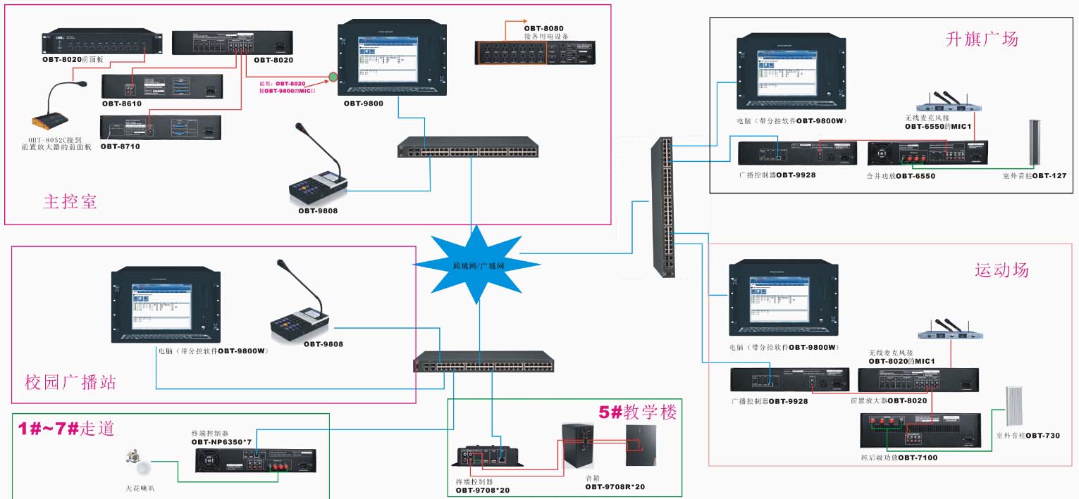 校內應用的數字IP網絡廣播,利用網絡通信ITC/IP協議的優點,采用基于現有的LAN/WAN網絡來建設,安裝時無需單獨布線。具有純數字音頻、雙向對講、免提對講、緊急呼叫、遠程呼叫、音樂廣播、應急廣播等功能,解決了傳輸區域大、傳輸難、音頻信號損耗高等問題。